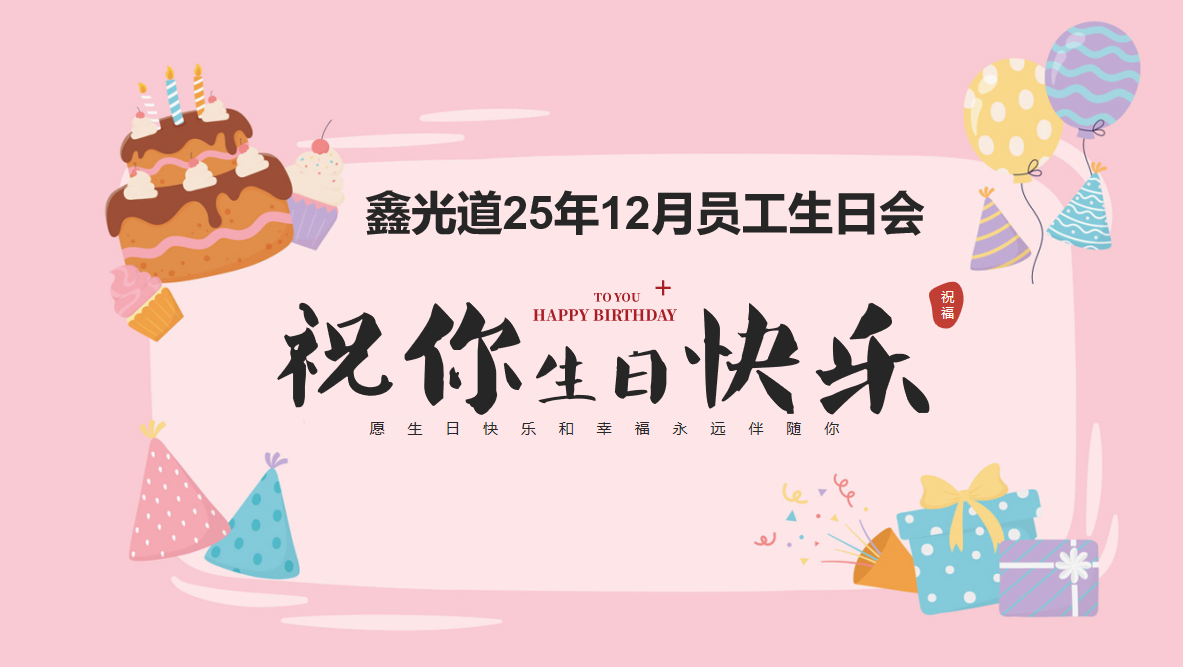 鑫光道25年12月份员工生日 时光流转,岁末情浓。在2025年即将落下帷幕之际,鑫光道公司为第四季度生日的员工举办了一场温馨而隆重的生日庆典。这不仅是对本季度寿星的祝福,更是对全年每一位员工成长与付出的感恩与致敬。 回首这一年,我们共同见证了鑫光道在挑战中稳步前行,在创新中不断突破。每一次进步的背后,都离不开每一位员工的智慧、汗水与奉献... 蛋糕上闪烁的烛光,映照着一张张灿烂的笑脸;欢快的生日
